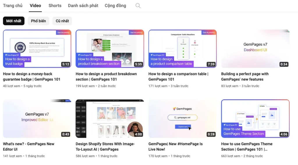 GemPages has its own tutorial video series that walks users through the process of building and customizing a Shopify storefront in the smartest and fastest way by using GemPages. The series breaks down every element that business owners need for a winning online store design, providing easy-to-follow instructions with short and visually appealing videos. By this way, GemPages not only educates users about its features but also positions it as a leading Shopify page builder.