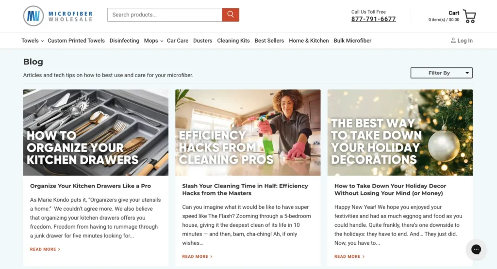 Take MicrofiberWholesales’ blog as an example. The B2B eCommerce company that sells microfiber cleaning products enriches its blog to be a trustworthy content hub in the industry. The blog offers a wealth of information, tips, and insights to help readers optimize their cleaning routines and make the most out of microfiber products.