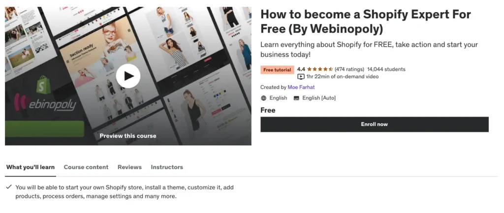 While Moe Farhat’s course is a 101 guide about the platform’s features and strategies, this free Shopify course provides a detailed step-by-step guide to creating a Shopify store, even without experience.