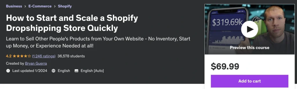 The longest yet most price-worthy Shopify that focuses on dropshipping is “How to Start and Scale a Shopify Dropshipping Store Quickly” by Bryan Guerra, a successful eCommerce entrepreneur.