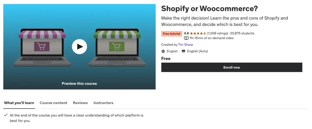 Here is a comprehensive course that precisely compared the two most used eCommerce platforms, “Shopify or WooCommerce?“. This course is designed by one of the best-selling Udemy Instructors in the field, Tim Sharp, with an expected final result: eCommerce beginners can choose the most suitable platform to locate their digital shops.