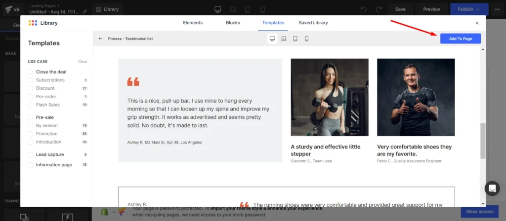 Step 3: Click “Add To Page” on your preferred template. In this case, assume you want the Testimonial listing template.