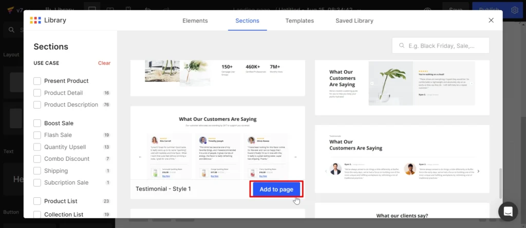 When it comes to spotlighting content customers and their positive experiences with your product, adding testimonials to your already-established store pages can be an excellent solution, thanks to GemPages’ pre-built section library. You can do as follows: